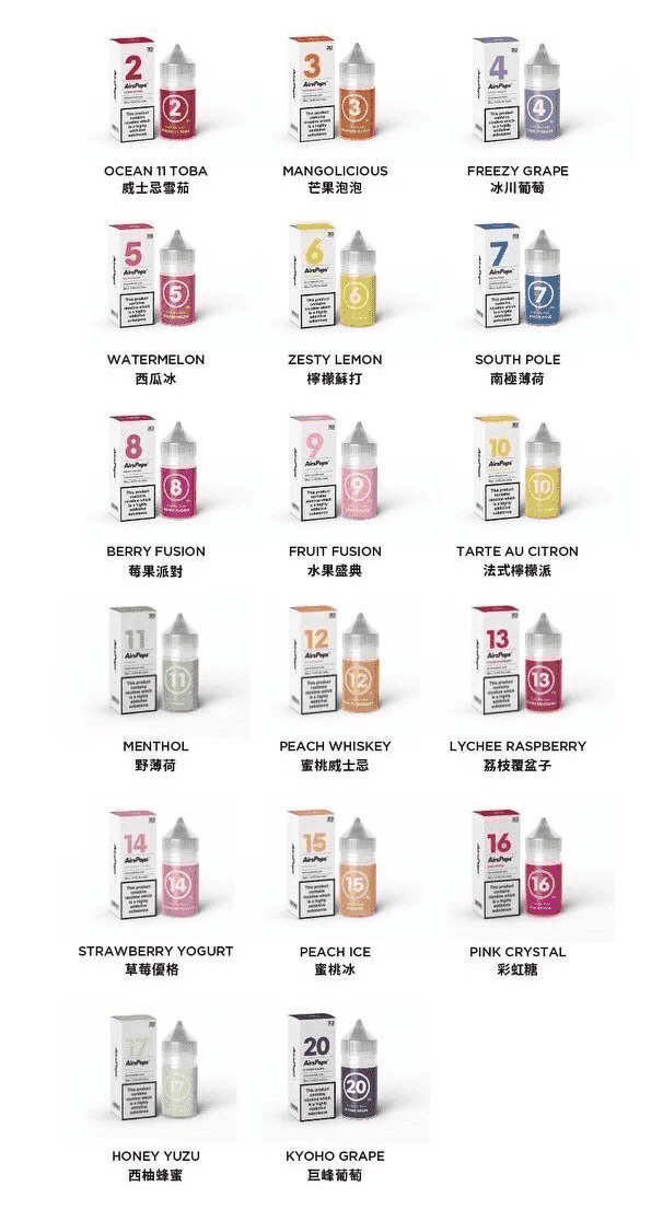 02威士忌雪茄, 03芒果, 04冰川葡萄, 05西瓜冰, 06檸檬蘇打, 07南極薄荷, 08莓果派對, 09水果盛典, 10法式檸檬塔, 11野薄荷, 12蜜桃威士忌, 13荔枝覆盆莓, 14草莓優格, 15蜜桃冰, 16彩虹糖, 17蜂蜜西柚, 18焦糖煙草, 19極地薄荷, 20巨峰葡萄, 21鳳梨芒果, 22冰橙, 23紅蘋果, 24香蕉冰, 25冰可樂, 26橘子, 27芭樂, 28泡泡糖, 29藍莓, 30菸草, 31混合煙草